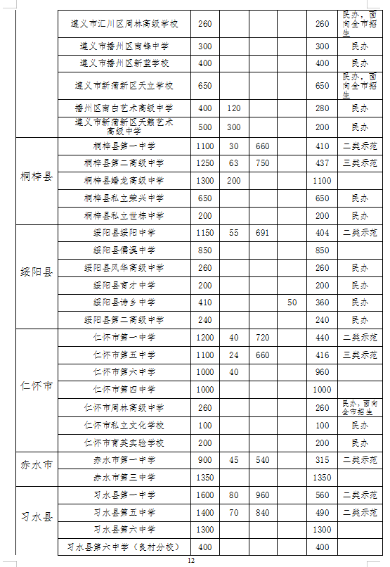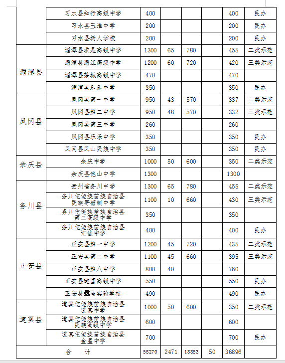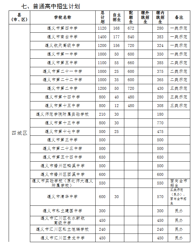 说明:高中学校招生计划、中职(技工)学校计划、“3+4”中本贯通和五年制大专招生计划均以“遵义市招生考试网”(http://www.zyszsksb.cn/)上公布的为准。