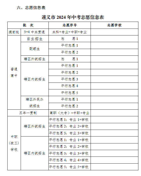(4)“辖区内统招生”设5个平行志愿。四城区考生在四城区内的普通高中学校和统招计划面向全市招生的民办高中学校中选报;其他县(市)考生在本县(市)内的普通高中学校和遵义市实验学校(原北京师范大学遵义附属学校)以及统招计划面向全市招生的民办高中学校中选报。